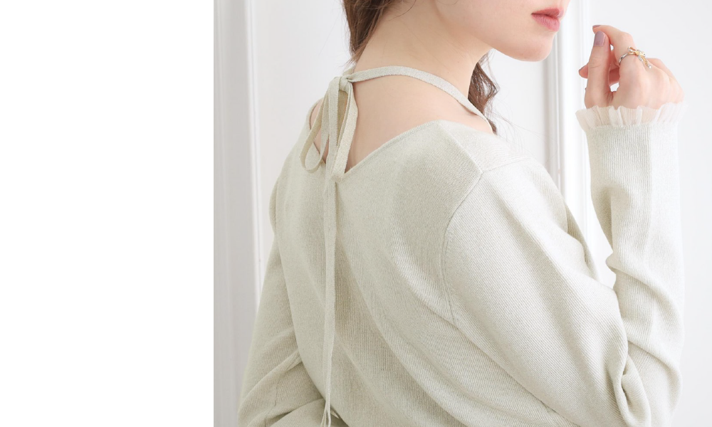 【大人可愛い・リボン取り外し可】前後2WAYラメリブ シアープチフリルニット