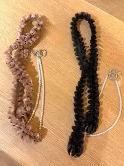 <ドットチュールパール調ストラップ>チュールとフェイクパールを組み合わせたオシャレ感のあるロングストラップです。チュールとフェイクパールは取り外し可能なのでそれぞれ別々でも使用できます。
