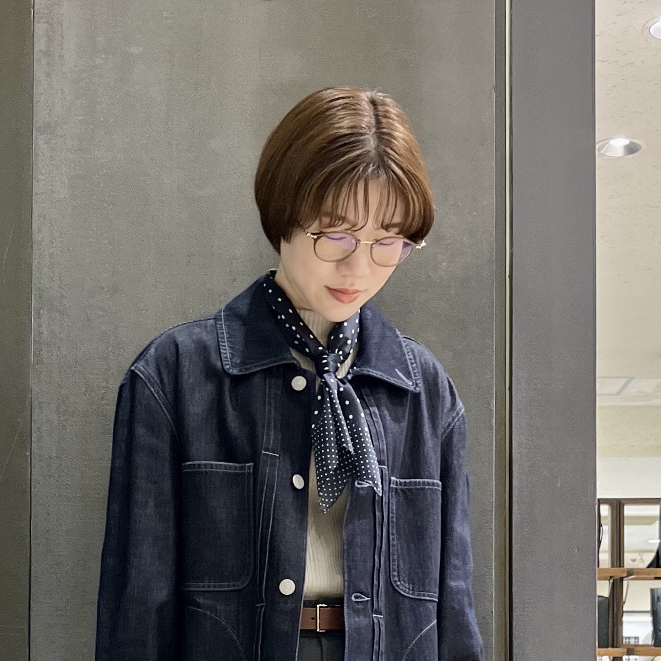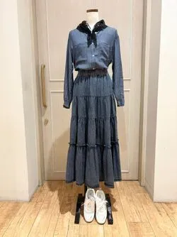 シンプルなデニムシャツにはリング付きスカーフを合わせてポイントに!