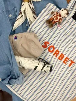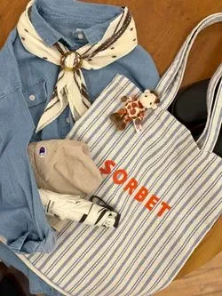 さわやかストライプのデザインとナチュラルなチェック柄のトートバッグ!メインとしてもミニバッグと一緒にサブバッグとしてもっても◎※A4サイズ可