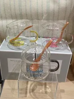 丸みのあるころんとした可愛い耐熱グラスに木製のスプーンがセット*温冷どちらも使えるのでオールシーズン使えます!便利な蓋付きで電子レンジで温めなおしも出来ちゃいます。蓋はティーバッグトレーにもなります。ドリンク以外でもアイスやヨーグルト、シリアルなどでも活用出来ちゃいます!!